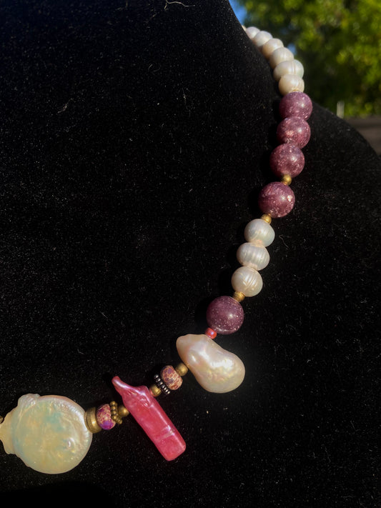 Freshwater Pearl with Maroon Lepidolite & Imperial Jasper