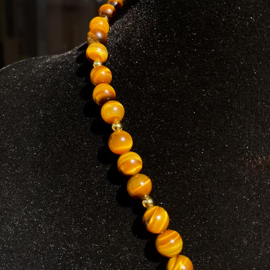 The necklace is made with secondhand tigers eye and stainless steel plated with 18k gold spacer beads! Finished with stainless steel plated with 18k gold closures.