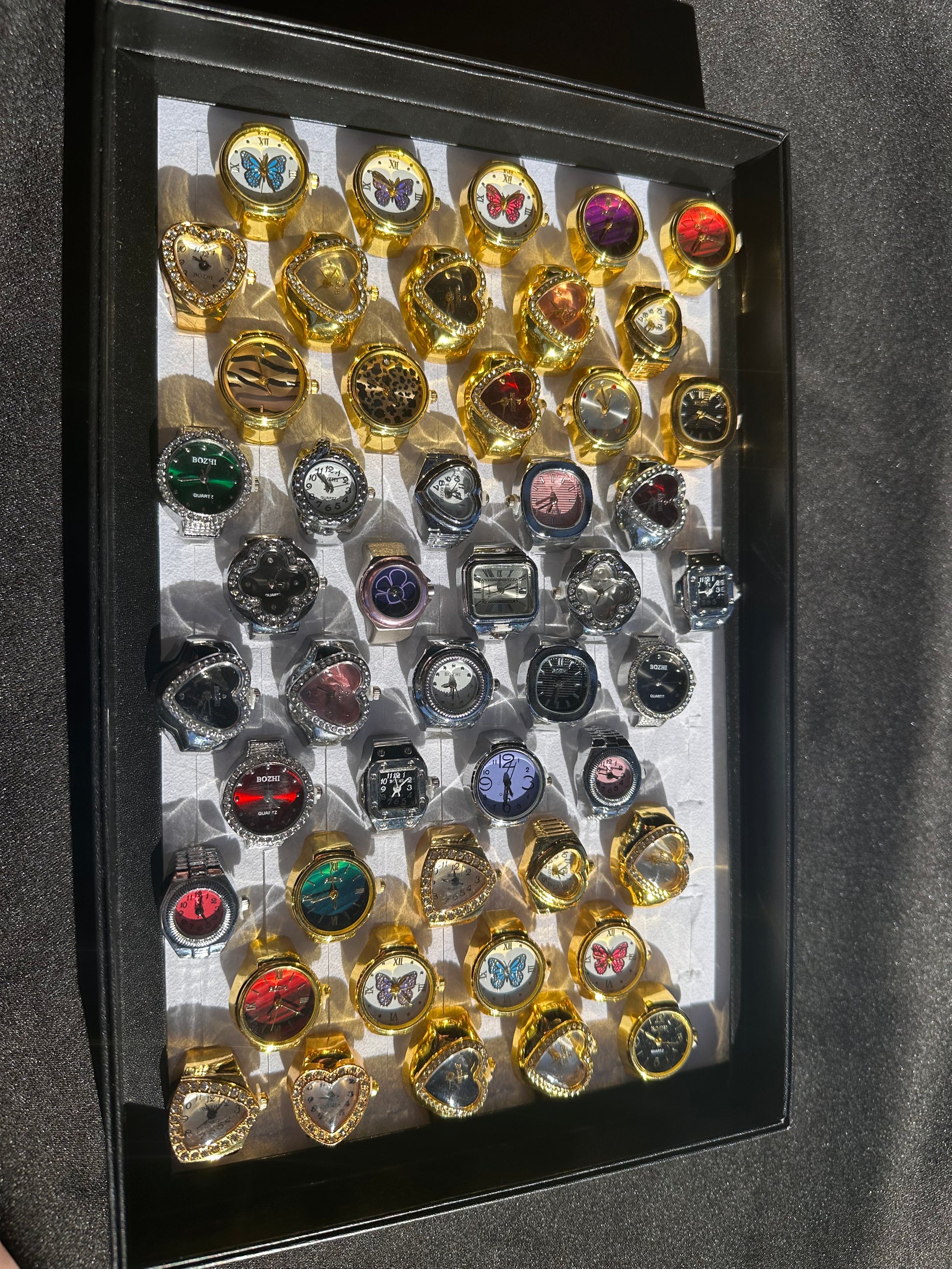 The coolest accessory to add to your jewelry collection! Ring Watches are something you don’t see everyday! An amazing unisex accessory bound to spark up conversation! Made of alloy and steel and plated with gold or silver tone. These have stretchy bands so they can fit most fingers! I’d say they start around us size 5-6 and can fit up to about 10 pretty comfortably. They stretch more but get tight.