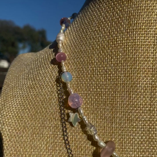 Handmade with mostly secondhand materials! Made with freshwater pearls, pink opalite roses, opalite, pink cat eye, glass, acrylic, shell stars & faux pearl accent teardrop beads. Handmade jellyfish made of stainless steel wire. Finished with stainless steel closures and chain details!