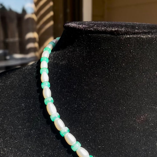 Made with all secondhand beads. Oval style freshwater pearls, 1 freshwater coin Pearl and fancy circular glass beads. Finished with stainless steel closures.