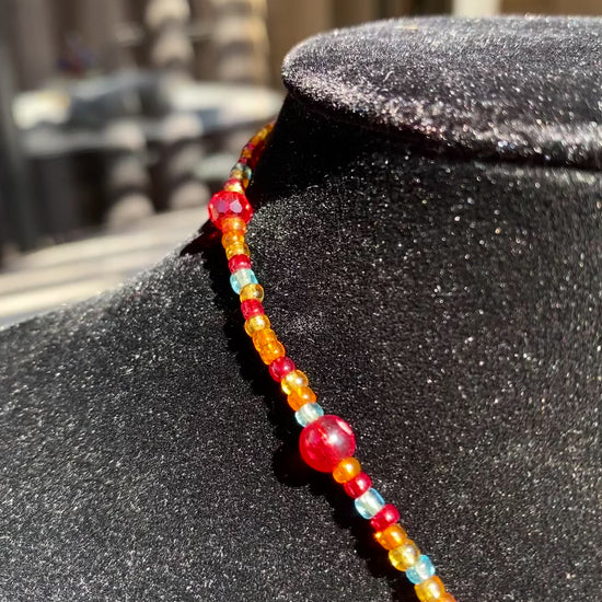 The necklace is made with secondhand seed beads and glass. Perfect as staple piece!Â