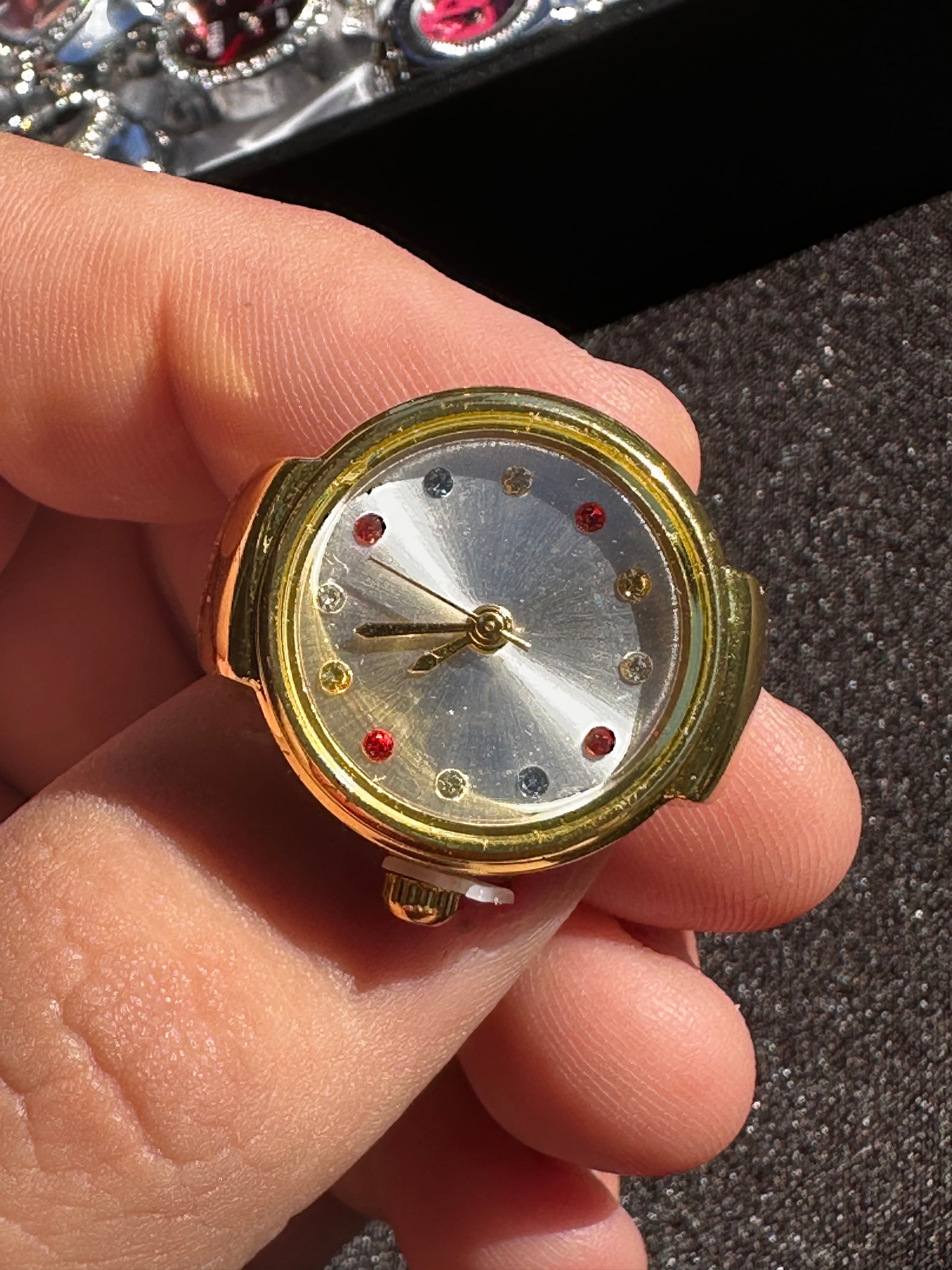 The coolest accessory to add to your jewelry collection! Ring Watches are something you don’t see everyday! An amazing unisex accessory bound to spark up conversation! Made of alloy and steel and plated with gold or silver tone. These have stretchy bands so they can fit most fingers! I’d say they start around us size 5-6 and can fit up to about 10 pretty comfortably. They stretch more but get tight.