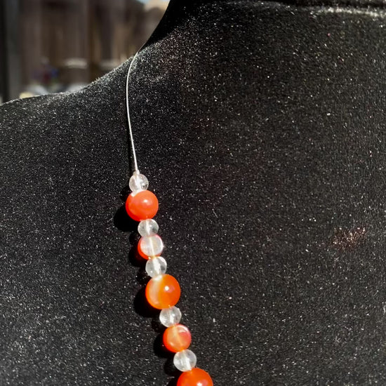 Handmade with carnelian and secondhand clear glass beads. Finished with a gold plated stainless steel spiral sun pendant and stainless steel closures