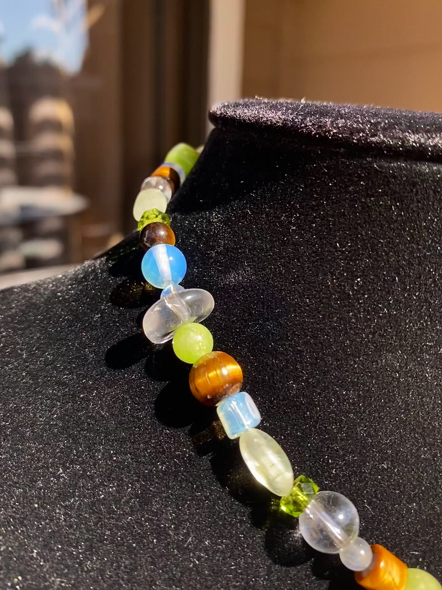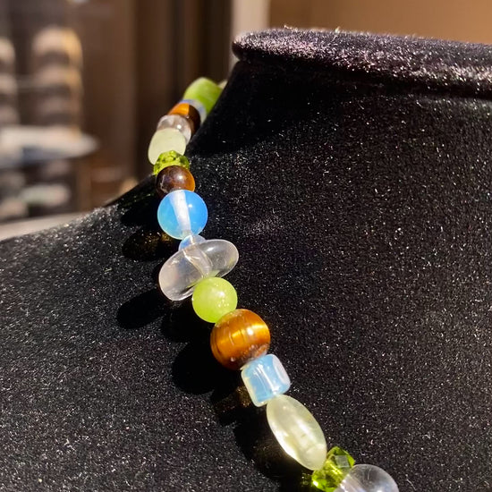 Made with fully crystals and glass. Crystals including tigers eye, peridot, prehnite, clear Quartz, labradorite and opalite. Finished with stainless steel closures.