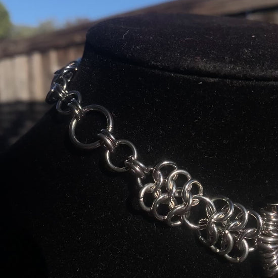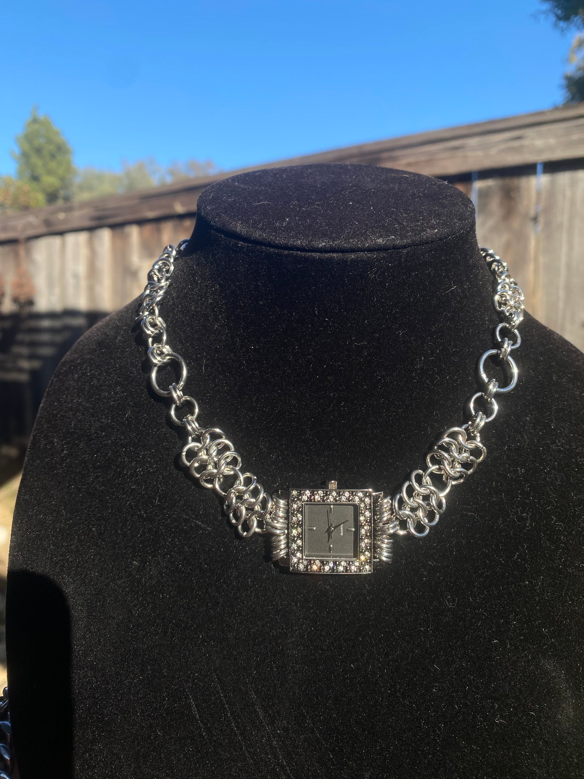 Handmade by me. Made to last. Refrain from getting wet, as watch face is alloy. Made with stainless steel jump rings, and a second hand watch face. Clasp closure on back. Can be extended or shortened upon request with no extra cost. Message if you’re wanting something like this!